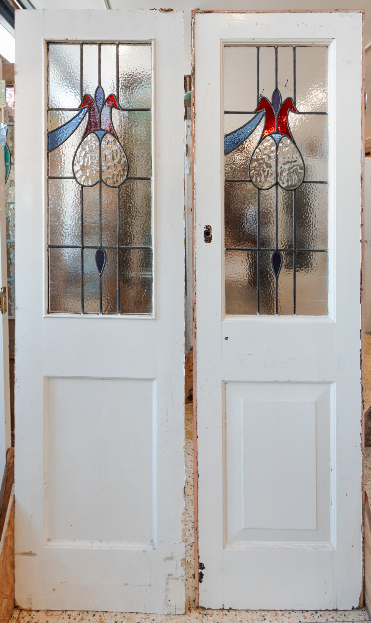 These antique stained glass doors have a few breaks in the glass. We are happy to replace the broken glass upon request, please reach out for a repair quote. Please review photos carefully, as they best represent condition.