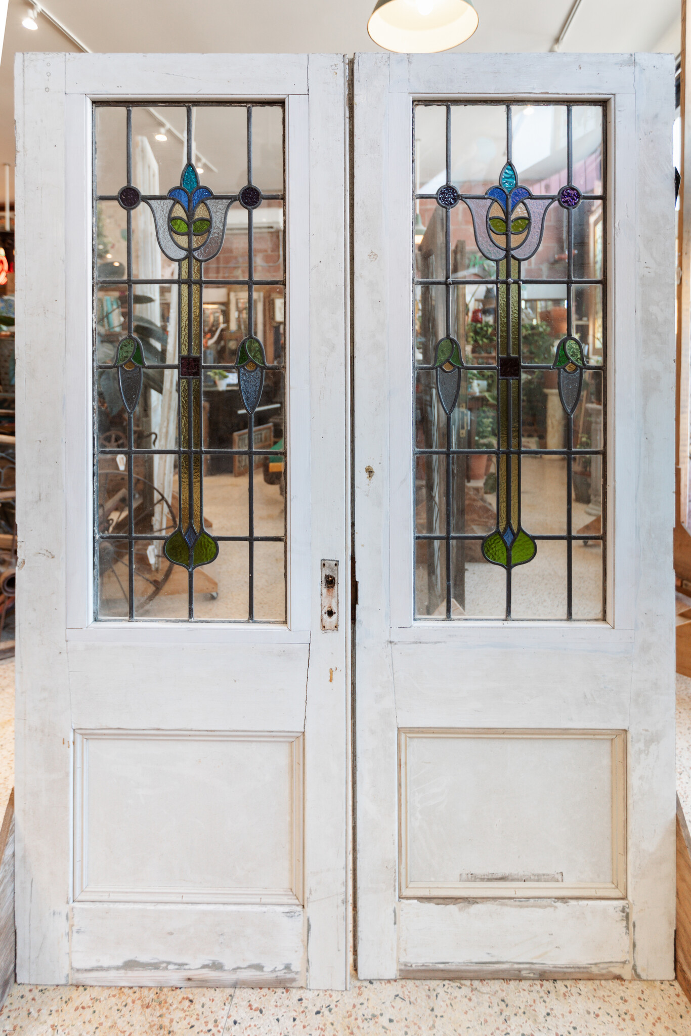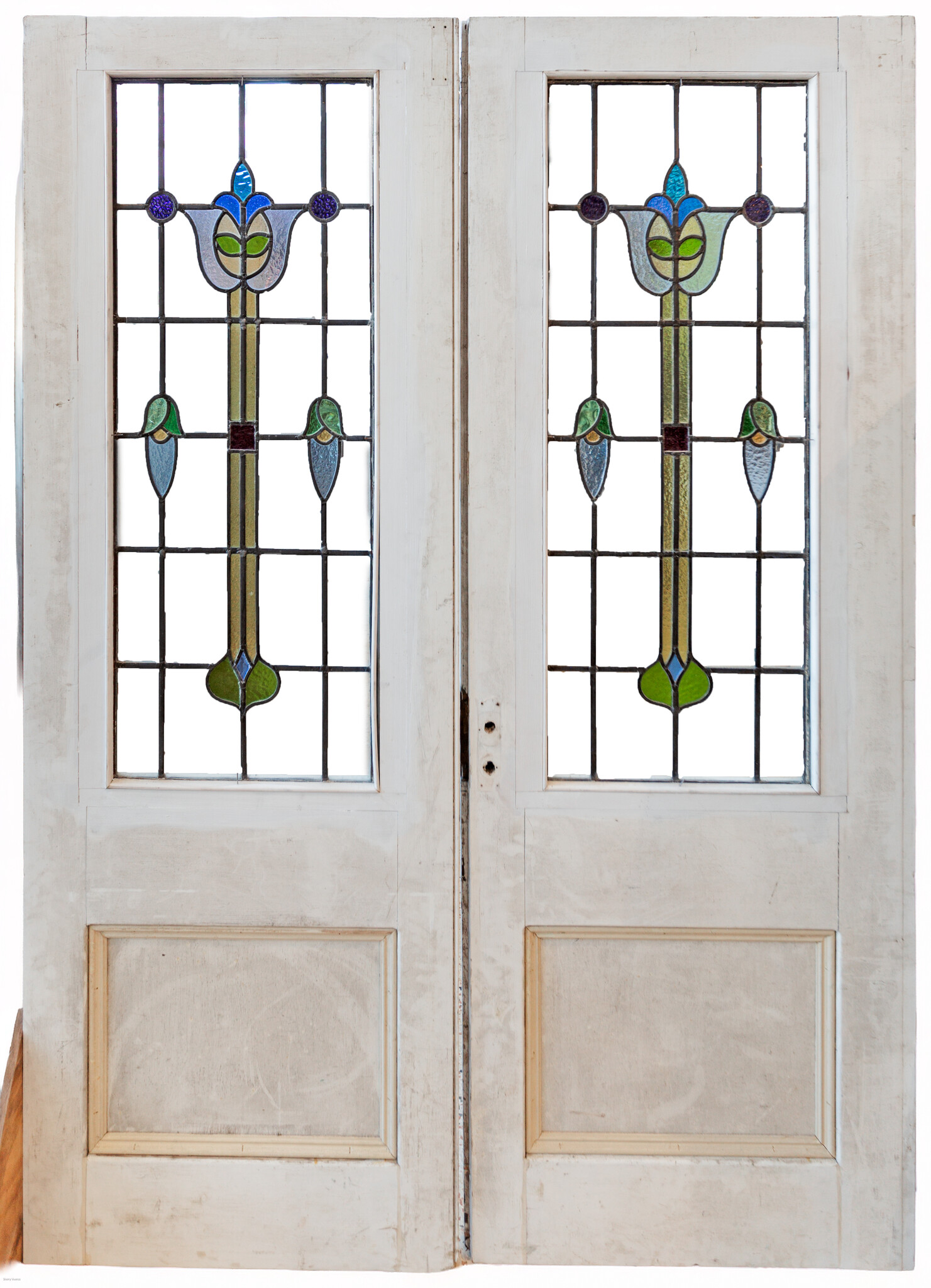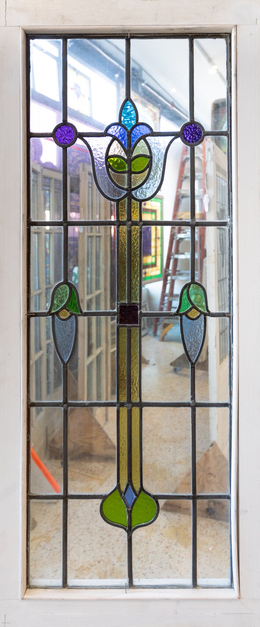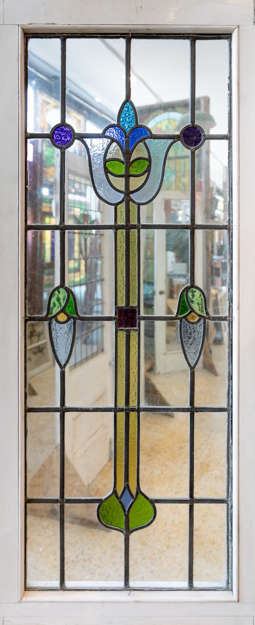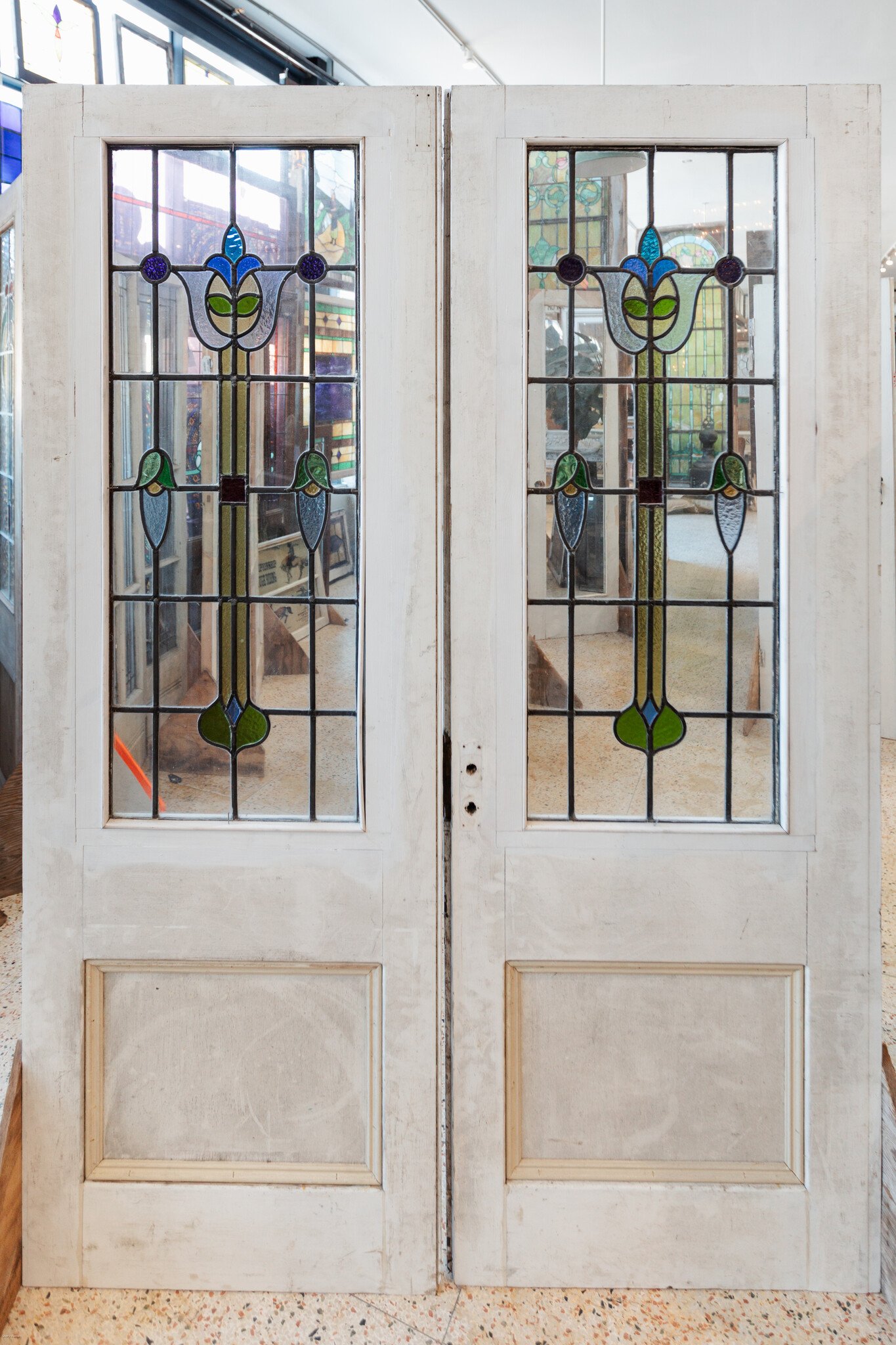 This antique stained glass door shows light signs of age, including one small hairline break in the glass. These are typical of doors of this era and do not detract from its overall character. We are happy to replace the broken glass upon request, please reach out for a repair quote. Please review photos carefully, as they best represent condition.