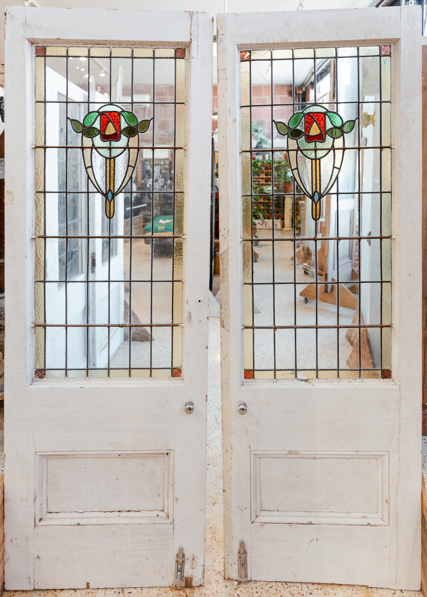 These antique stained glass doors have a few breaks in the glass. We are happy to replace the broken glass upon request, please reach out for a repair quote. Please review photos carefully, as they best represent condition.